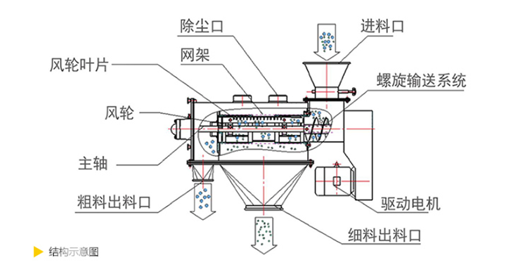 离心式筛分机从外观上看上部为水平放置的圆柱形、下部为圆锥形的密闭容器,筛机下面有支腿以支撑整个筛机。电机通常位于设备顶部或底部,通过皮带或直接驱动主轴。进料口通常在筒的一端或顶部,物料通过管道或漏斗送入。出料口有两处,一处是细颗粒出口,一处是大颗粒出口,一般在筒的另一端或筒侧面。