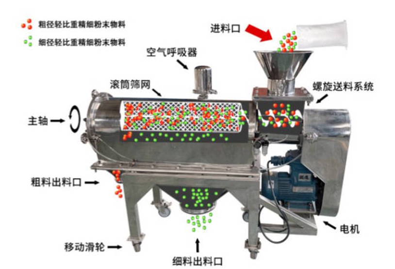 气流筛分机:主体为立式密闭圆筒筛箱,中心装有高速旋转的转子(风轮)。筛网呈圆筒状嵌于箱体内壁。工作时,风机产生的气流携带物料,在转子作用下使细粉穿透筛网,粗粉被分离。通常配有旋风分离器实现气固分离。