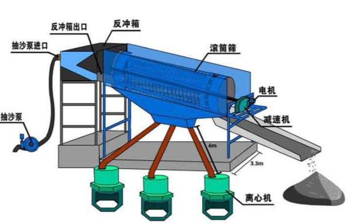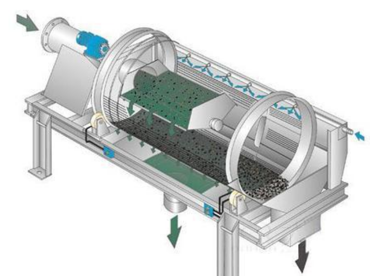 滚筒筛沙机主要有振动电机、减速机、滚筒装置、机架、密封盖、进出料口等部分组成,滚筒装置倾斜安装在机架上,电机经减速机与滚筒装置通过联轴器连接在一起,驱动滚筒装置绕其轴线转动。